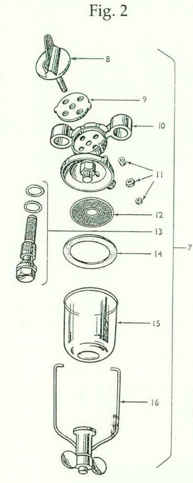 Petrol enters the carburettor at the banjo union (7) and passes into the float chamber through the needle and seating assembly (14). It will be observed that the float chamber Of bowl is of special construction, embodying a dual float (12) system; as fuel rises in the chamber the floats will be lifted unti!, at the predetermined level, they will press the needle on to its seating and thus prevent the entry of more fuel.