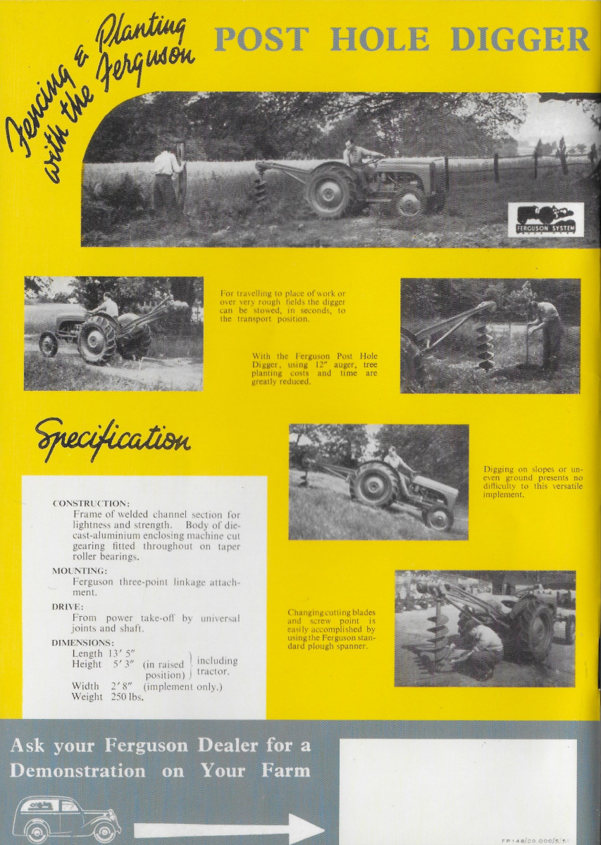 The first public outing for the Ferguson ‘A’ in England took place on Dormington Court Farm near Hereford in May 1936. Here the tractor is performing the classic Ferguson demonstration of tilling a small fenced compound. Note the hop yards at the rear. Does anyone know anyone who was there? Copyright photo courtesy, Institute of Ag. History and Museum of Rural Life, Reading University